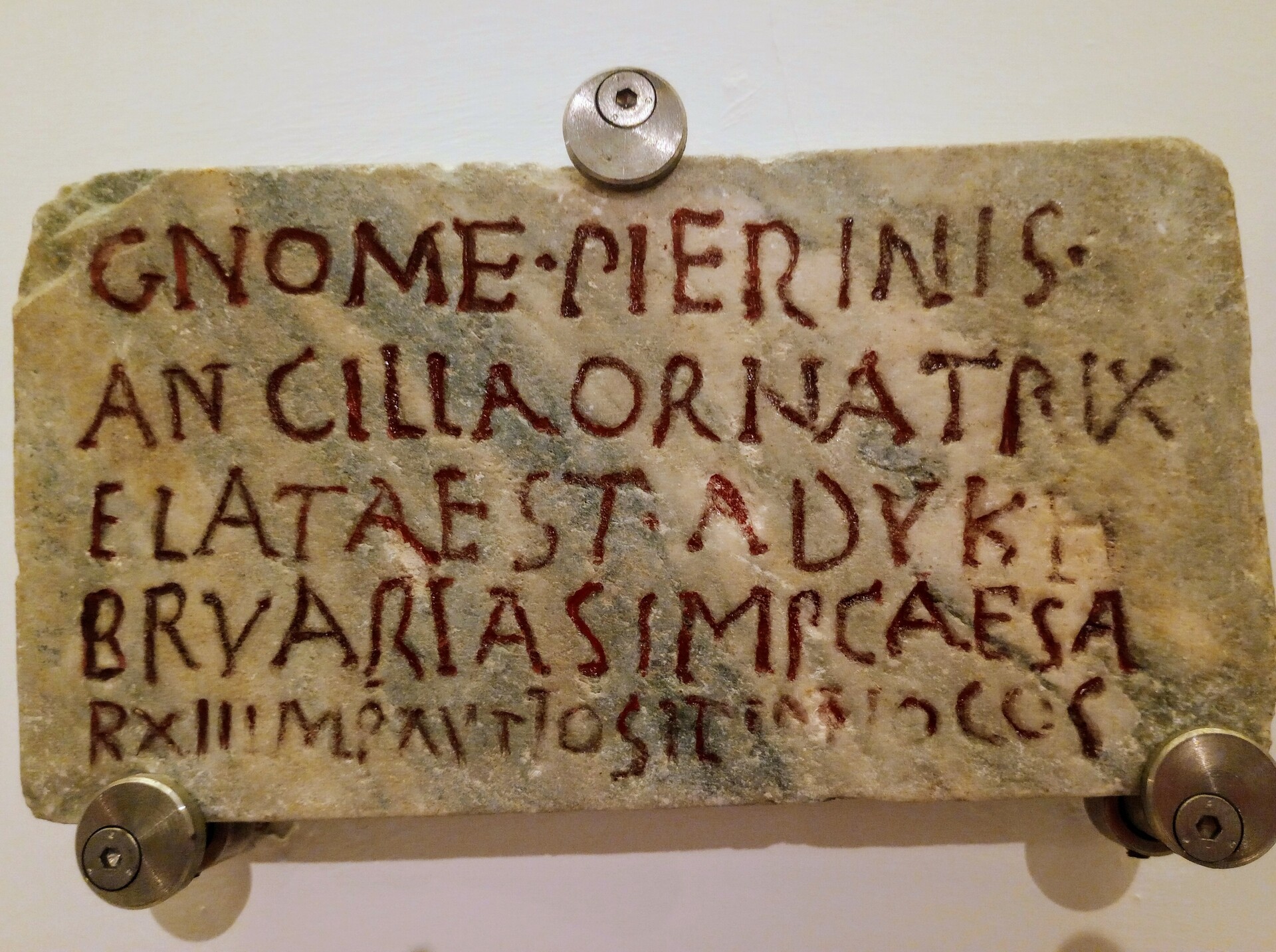 A slab of Gnome Pierinis's maid who used to be her hairdresser. She was buried on the 28th January 2 AD. Rome, Terme Diocletiano.